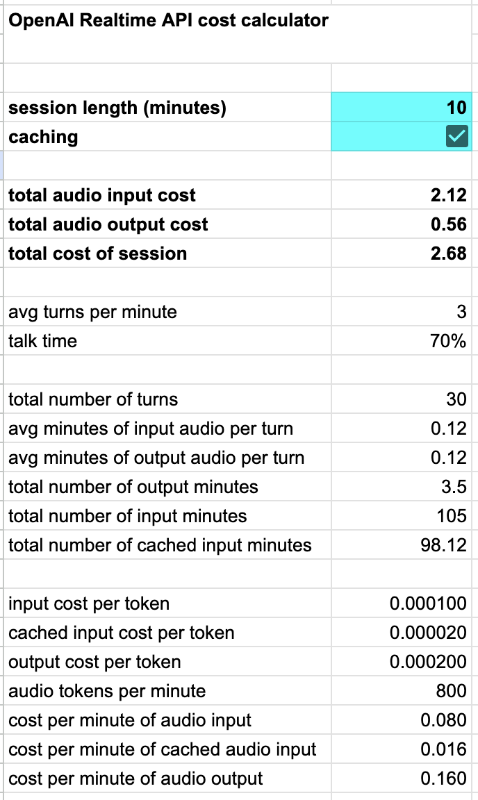 A spreadsheet to calculate per-minute costs for voice AI agents
